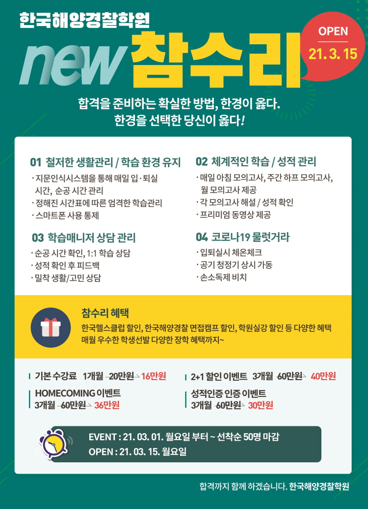 한국해양경찰찰학원이 운영하는 관리형 독서실 "참수리" 를 소개합니다 ~ 20-3차 이후 21-1차 대비를 위해 3개월동안 집중해서 공부를 희망 하시는 분들,